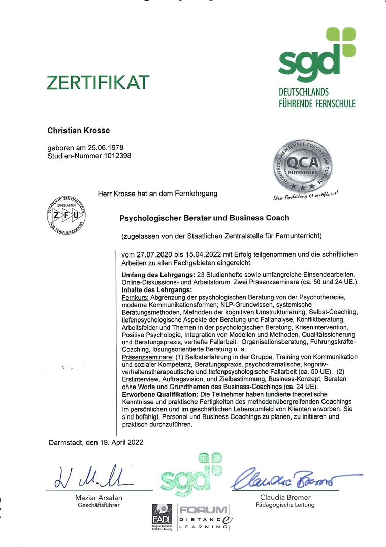 - Abschluss SGD - Zertifikat "Psychologische Beratung und Business Coaching"